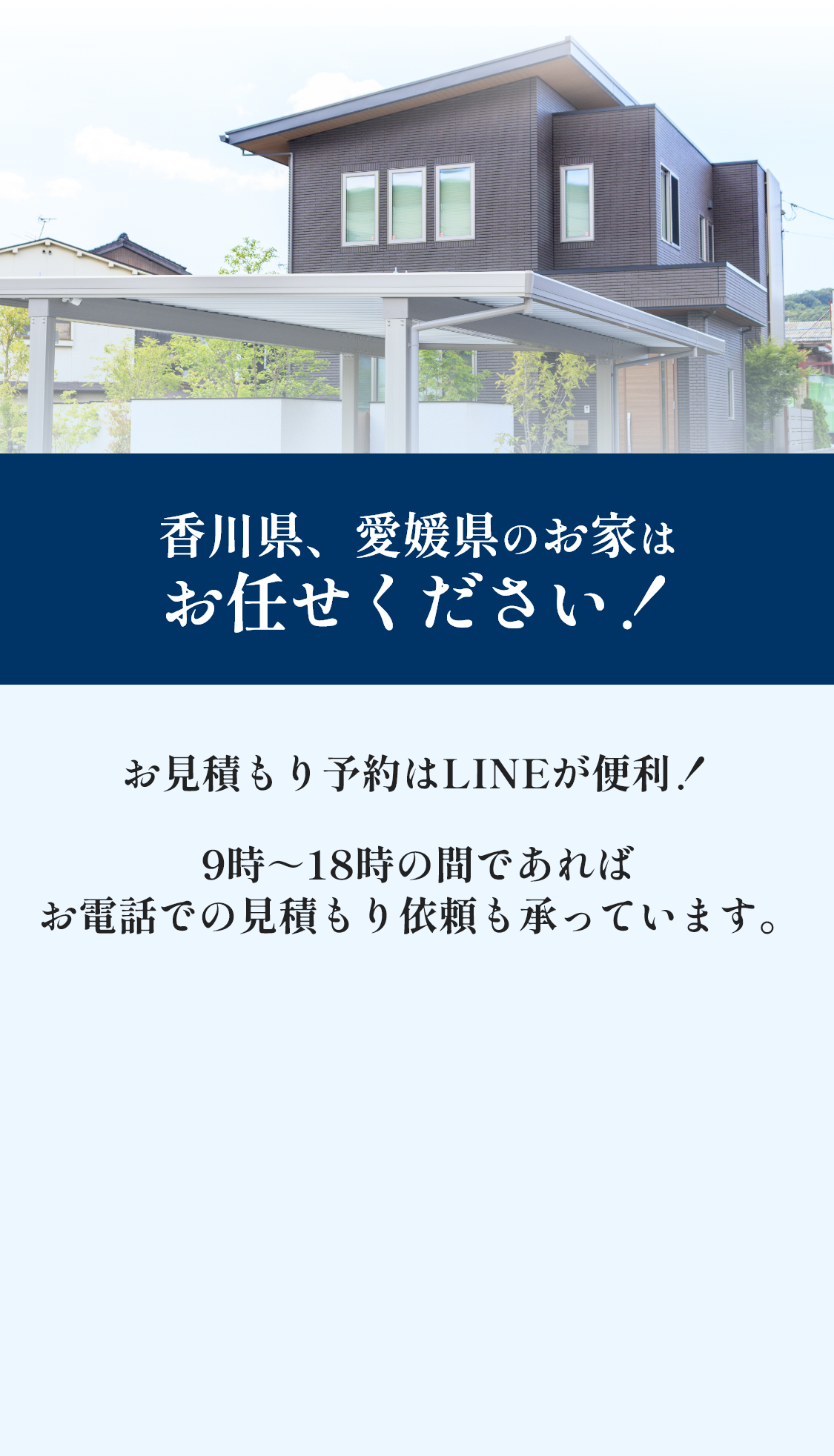 香川県で長年培った技術と信頼をもとに、不安を1つずつ丁寧に解消し、期待以上の仕上がりをお届けします。「ここに頼んでよかった」と心から思っていただける存在でありたい。そんな想いで、全力で理想の住まいづくりをサポートします。